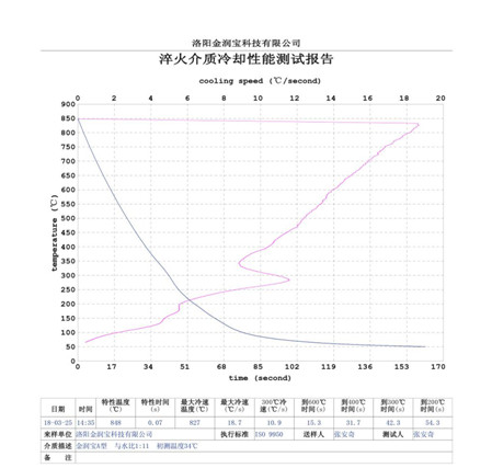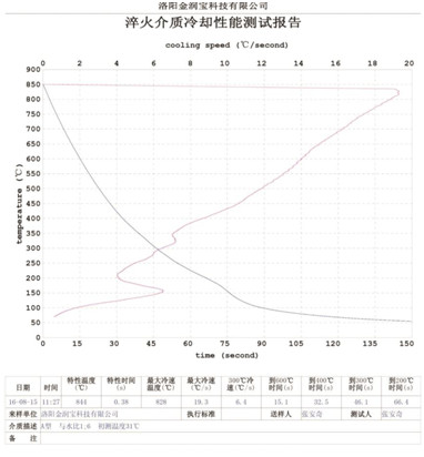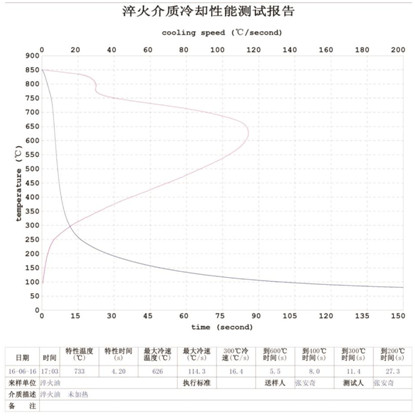 淬厚大件高鉻鑄鐵適宜的ZFQ-A型淬火劑的濃度:原液與水配比1:6,其 大冷卻速度150C/s——200C/s之間, 大冷卻速度所在的溫度在7800C——8300C之間,在3000C的冷卻速度小于6.50C/s,在3000C到2000C馬氏體轉變溫度區域內所用時間大于20秒(S),(采用冷卻介質測定儀測定,測定溶液溫度300C,)。
